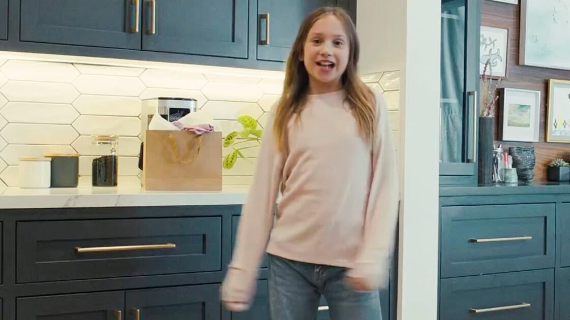 The ad sees the kid trying to show off her new purchase: a tie-dye top but dad interrupts. They are in the kitchen after Jeremy came home from the grocery store with Silk. Renner shared the ad on Instagram and marked it an ad